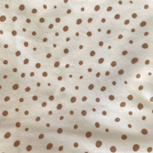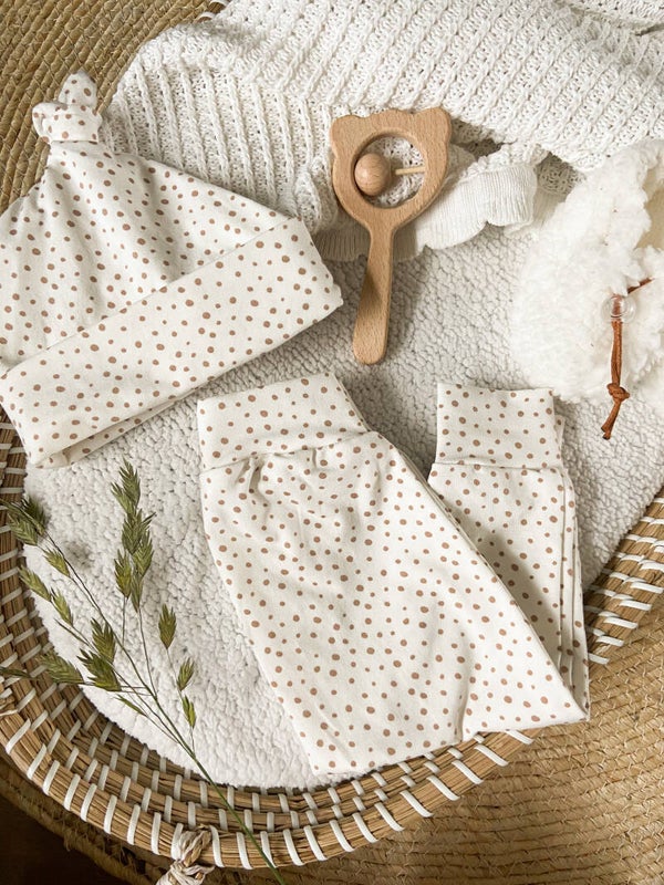 Een neutraal baby-knoopmutsje met zandkleurige stipjes. Matcht leuk met het stipjes broekje! De mutsjes zijn in één maat beschikbaar, namelijk 56/62.