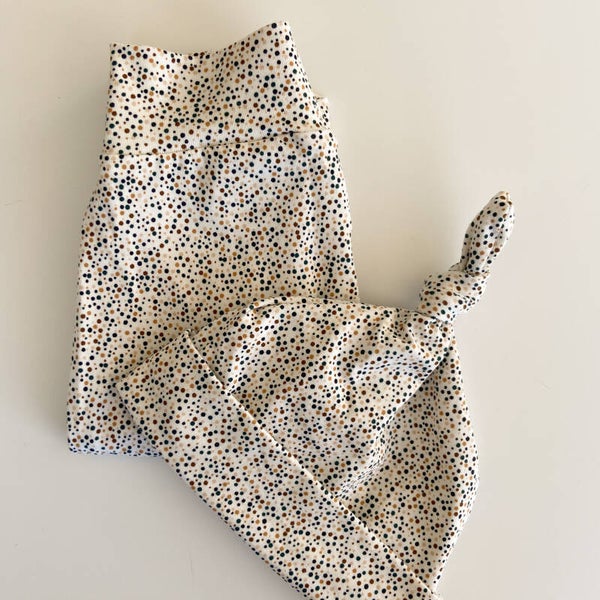 Een neutraal baby-knoopmutsje met mini blauw/zandkleurige confetti. Matcht leuk met hetzelfde broekje! De mutsjes zijn in één maat beschikbaar, namelijk 56/62.