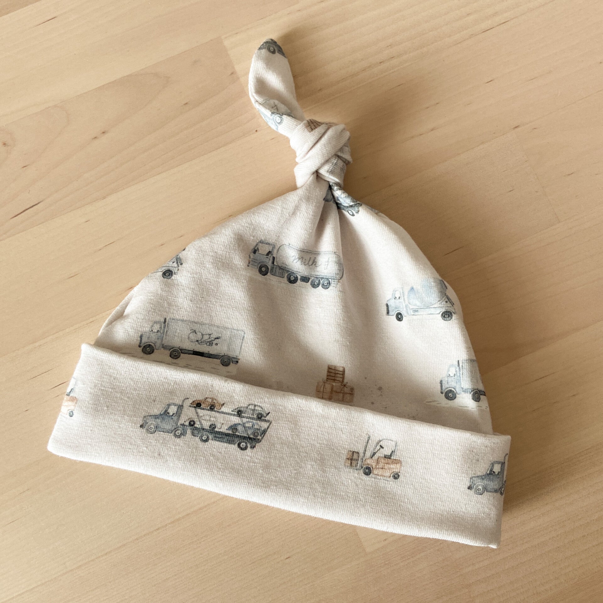 Een stoer baby-knoopmutsje met verschillende soorten trucks. Matcht leuk met hetzelfde broekje! De mutsjes zijn in één maat beschikbaar, namelijk 56/62.