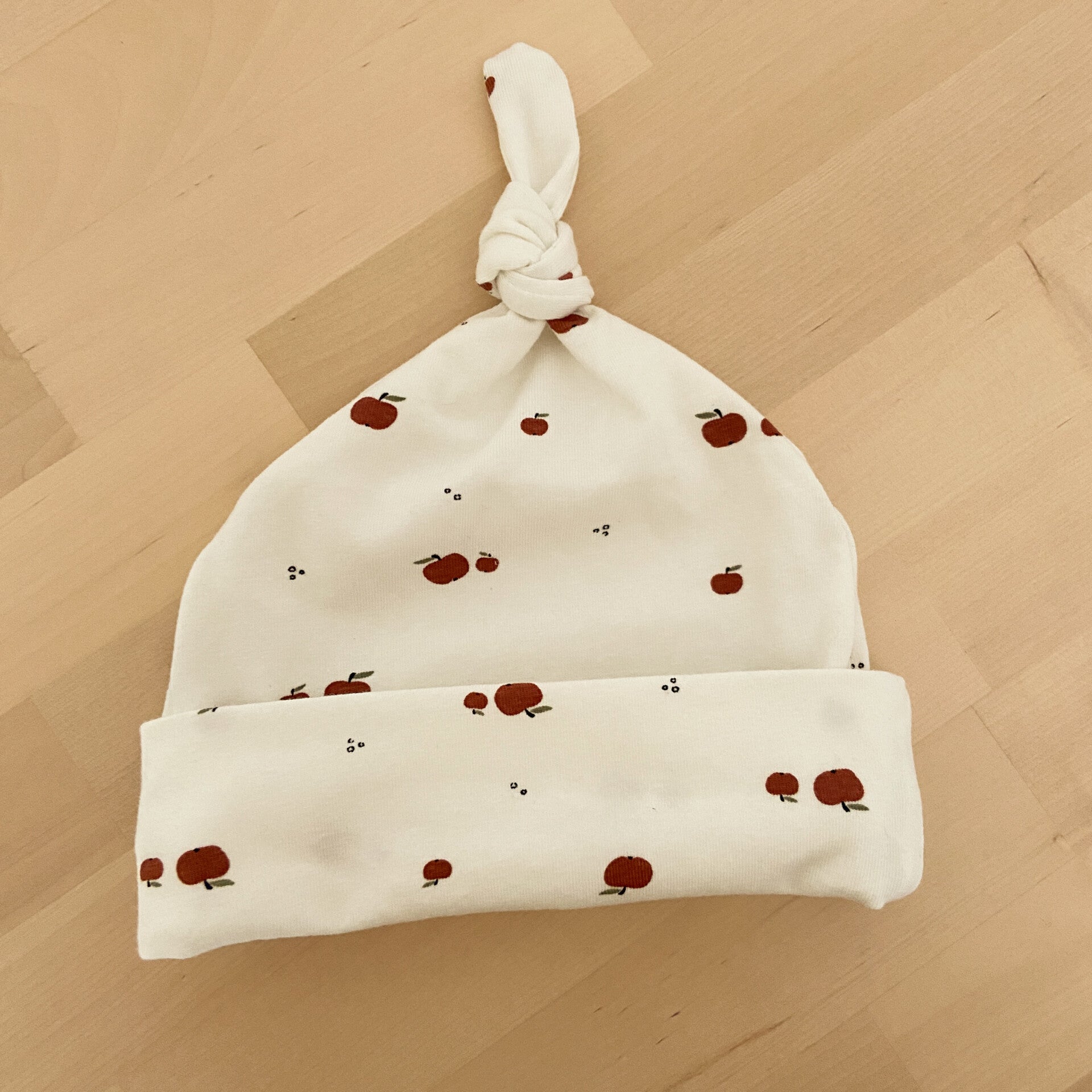 Een neutraal baby-knoopmutsje met kleine appeltjes. Matcht leuk met hetzelfde broekje! De mutsjes zijn in één maat beschikbaar, namelijk 56/62.