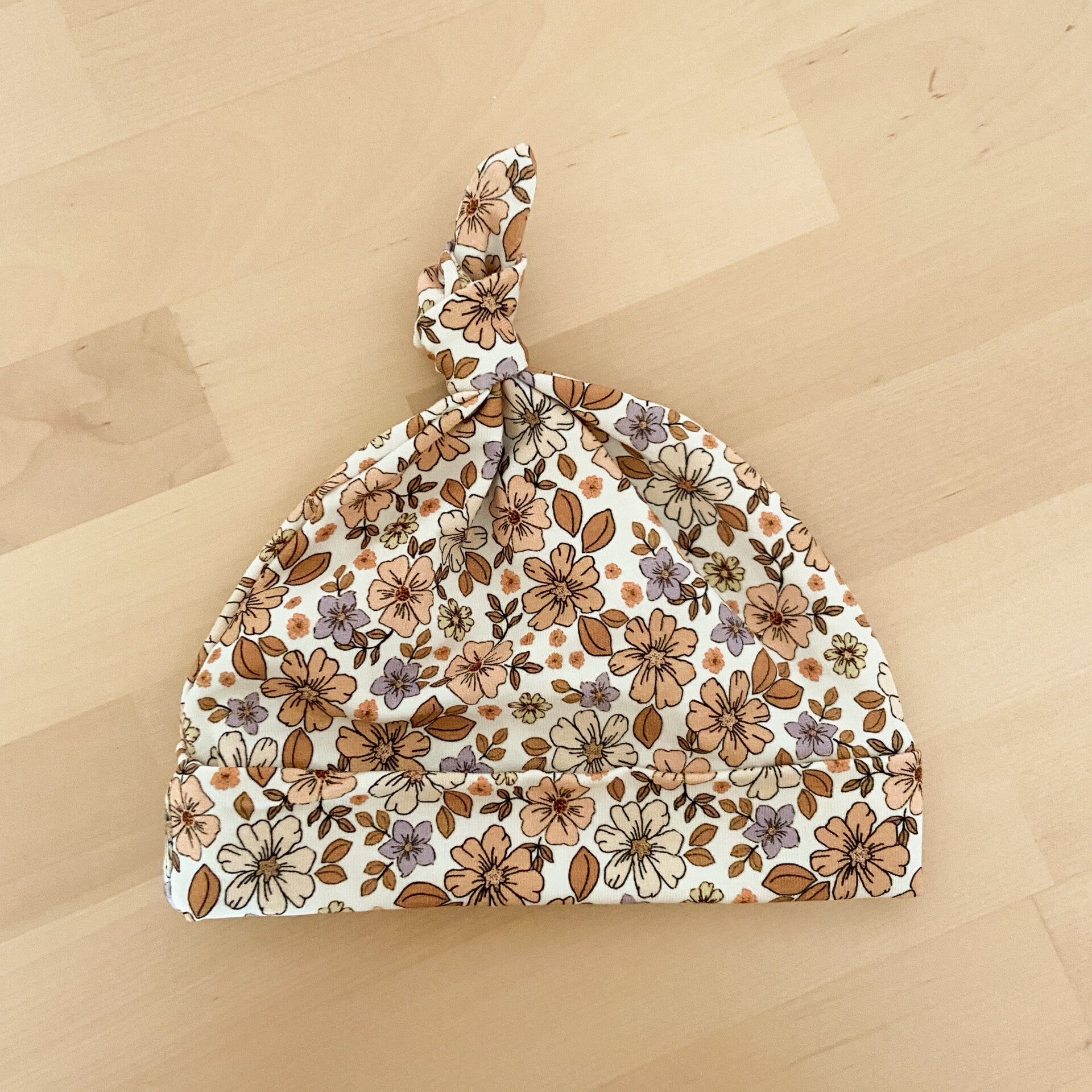 Een lief baby-knoopmutsje met allerlei bloemen in roze/nude/lila tinten. Matcht leuk met hetzelfde broekje! De mutsjes zijn in één maat beschikbaar, namelijk 56/62.