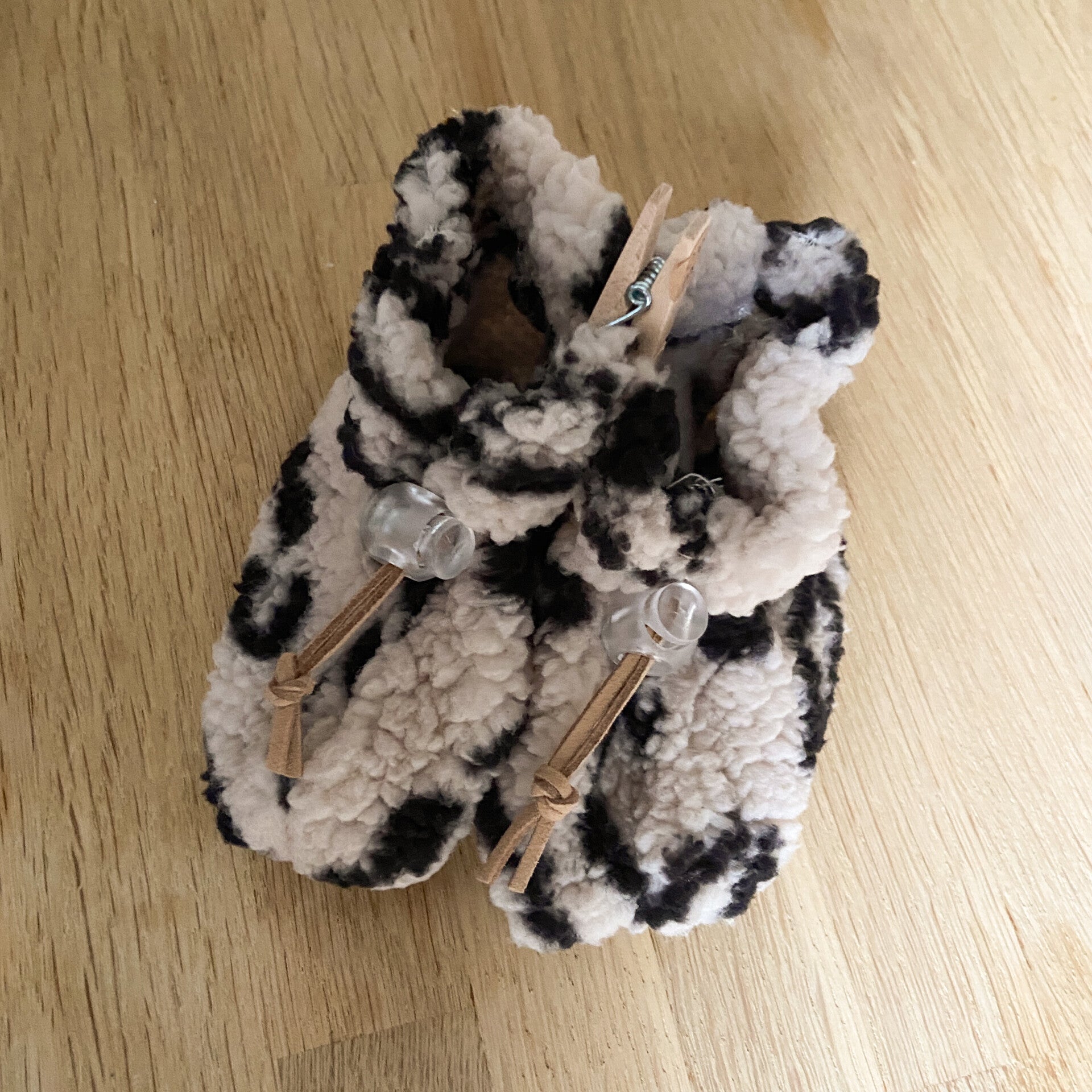 De slofjes zijn gemaakt van zachte baby/teddystof en is rekbaar. De slofjes zijn beschikbaar in twee maten; maat S en maat M.